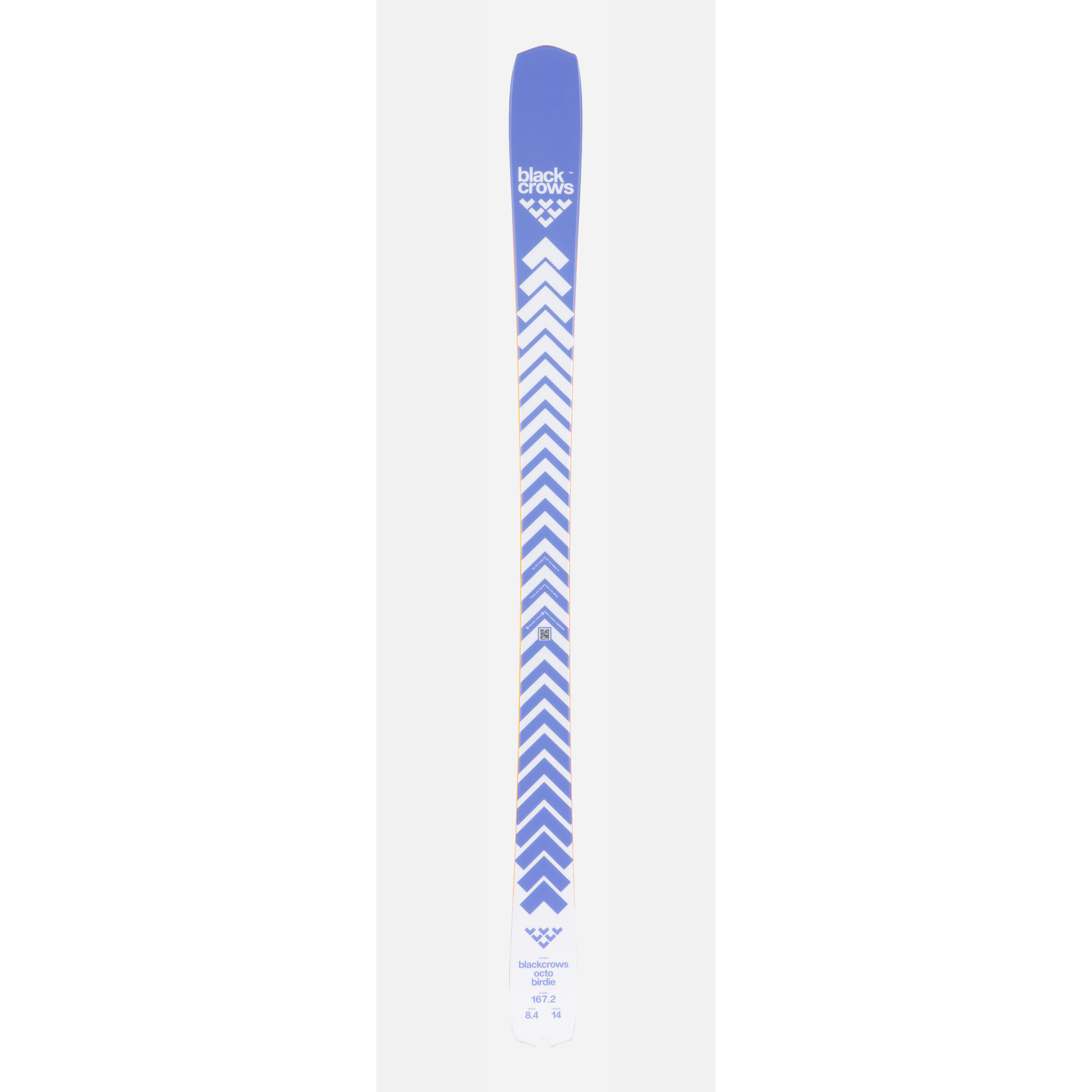 Octo Birdie! Here's a brand new all-terrain ski, a young cousin inspired by the Mirus, UFO ski and considerable success at blackcrows over the last two years. With the Octo Birdie, we want to take our exploration of on-piste and piste-side skiing a step further, by disrupting the way it's done, to enhance the skier's enjoyment of the sport. The aim is to mix angular curves with newschool-inspired ease. The Octo Birdie is also a UFO for carving, and will appeal to fanatics and novices alike. The swallowtail is there again, for style. Smile on to the next turn.